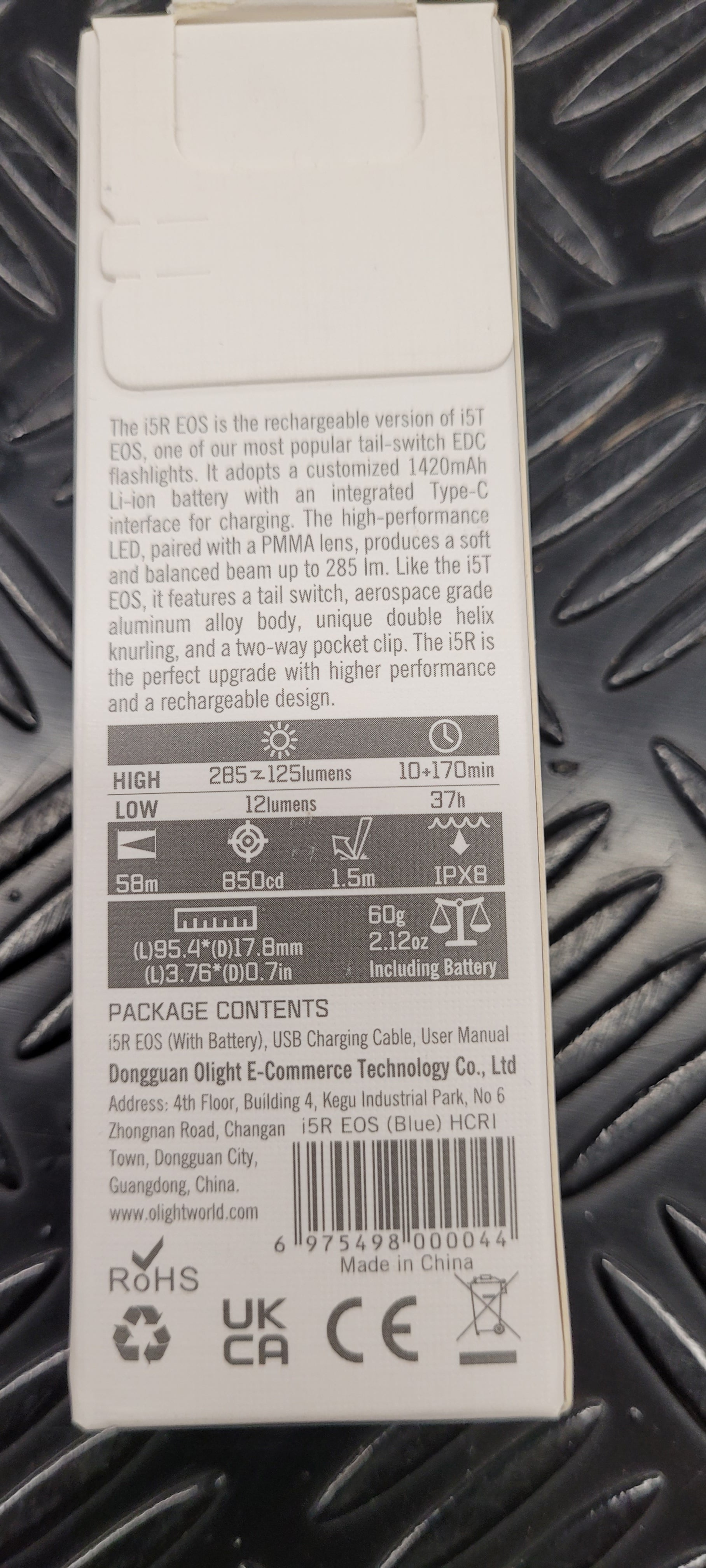 Recharable olight flashlight. Battery lasts up to 37 hours. USB c type charger. Beam distance 58m. Max brightness 285 lumens.
